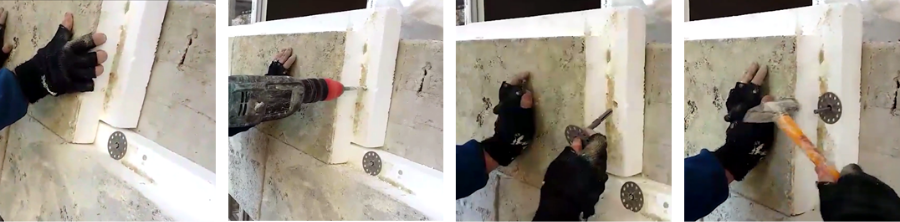 Нивелирането на плочите и тяхното подравняване се извършва едновременно с притискането им към стената. Непосредствено след това се извършва и дюбелирането им.