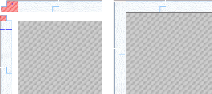 За коректното срещане на плочите по ръбовете на сградата, е необходимо в задната част на двата панела, част от панелите да бъде изрязана вертикално. Както е показано на схемата – отстранява се защрихованата в червено част, където B = A+ Дебелината на лепилото.