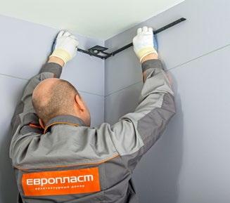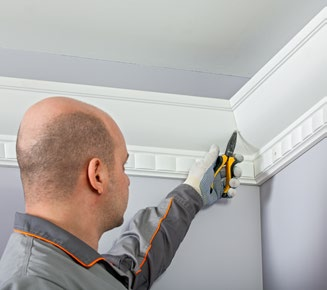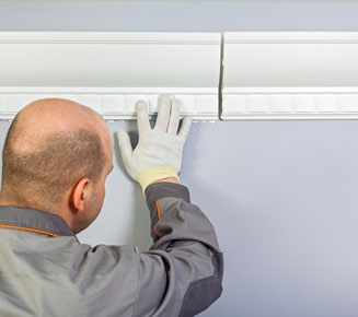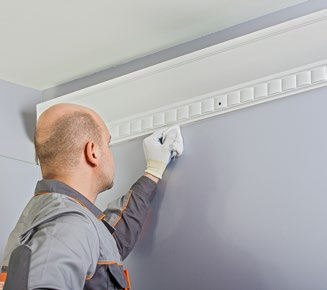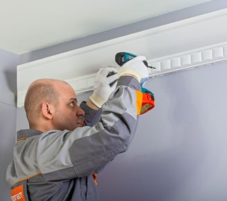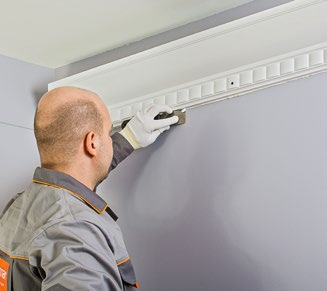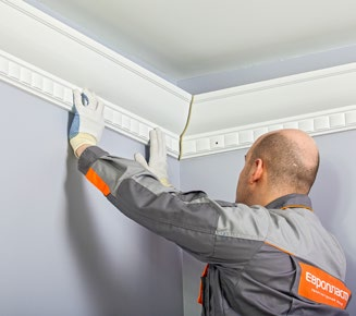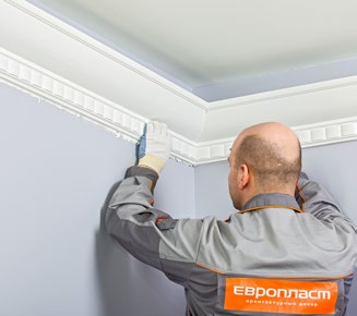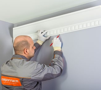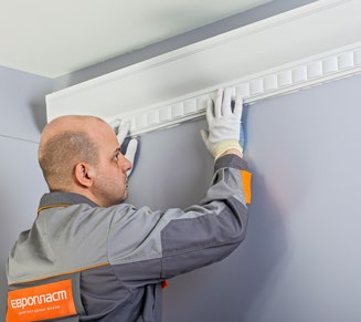 Притиснете корниза към стената и тавана, докато лепилото не се покаже от двете страни на профила. Чрез плавно наместване на елемента по протежението на стената, притиснете към съседния корниз, докато лепилото не се появи по протежението на свързващата фуга.