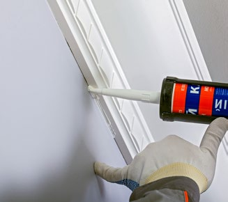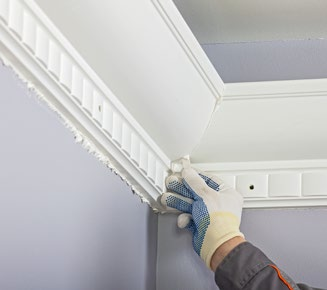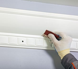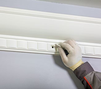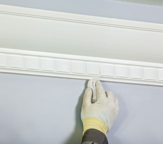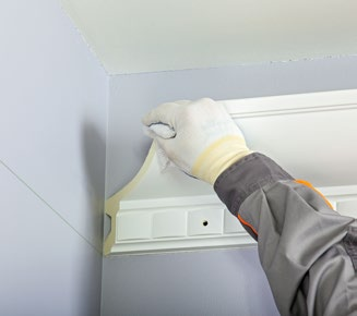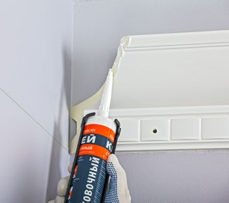 Оформяне на свързващите фуги: нанесете Лепило за свързващи фуги от страната на повърхността на вече монтирания корниз.