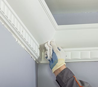 Почистете зоната на контакт със стената и тавана с помощта на влажна кърпа. Навлажнете кърпата с вода, в случай на работа с Монтажно лепило и с разредител, при работа с Универсално или Лепило за свързващи фуги.