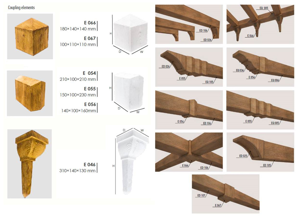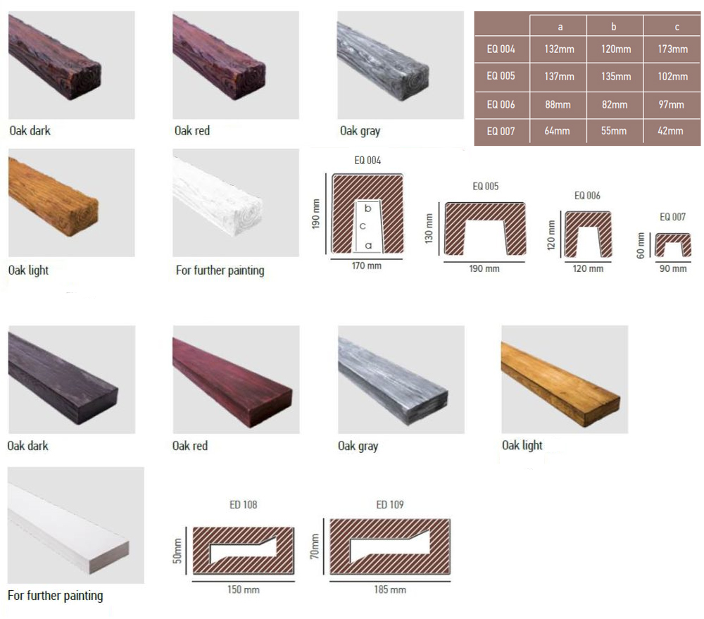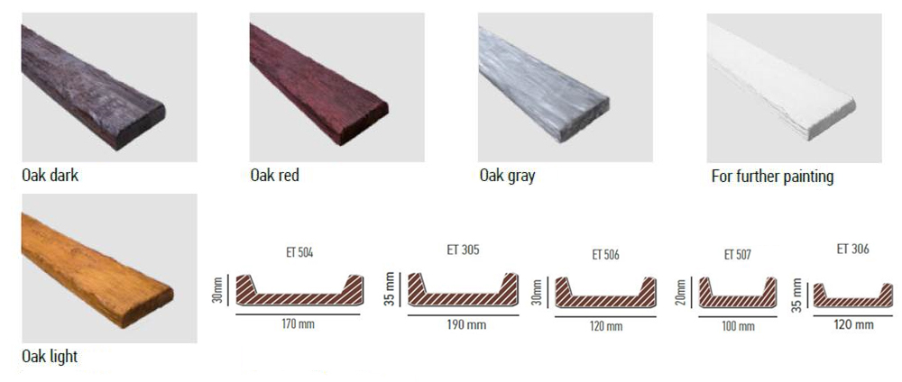 Декоративните греди, дъски и панели се предлагат в различни нюанси, имитиращи естествена дървесина. В комбинация, различните размери на тяхното напречно сечение и петте им цвята заедно с допълнителните елементи (конзоли, съединители и обковни ленти) ще Ви помогнат да реализирате всяка идея за дизайн и да получите цялостен и съвършен интериор.