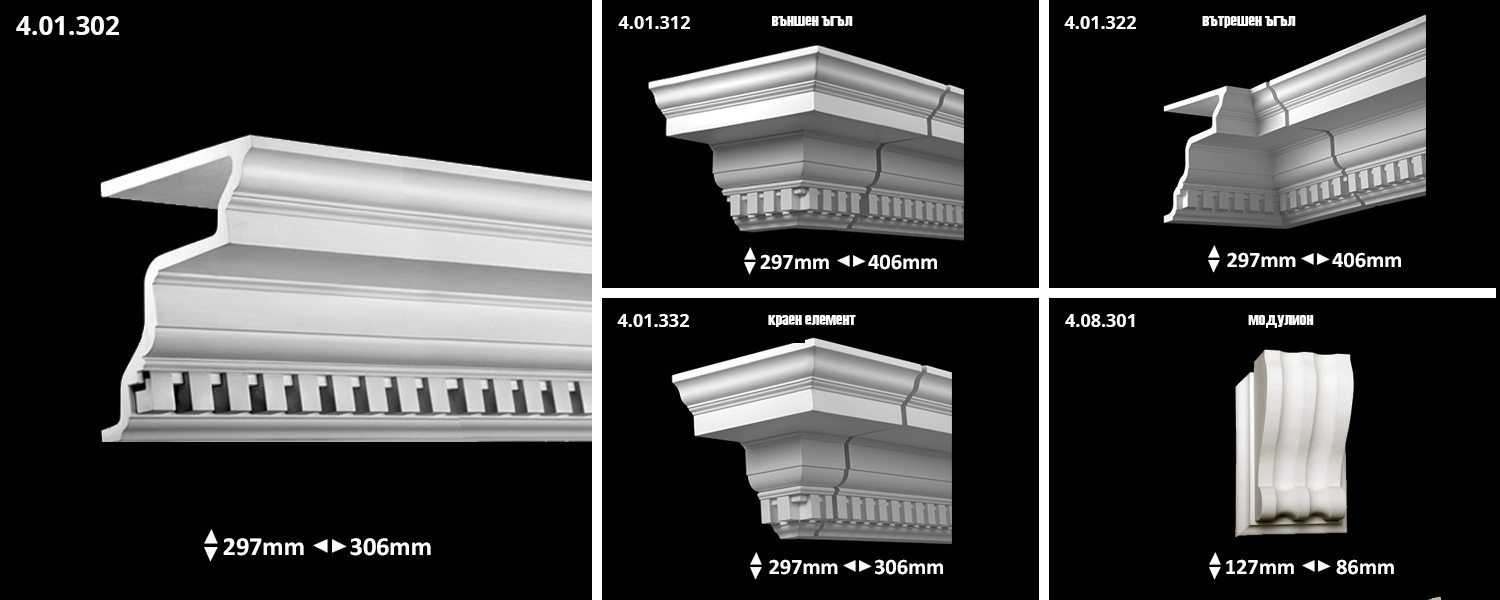 Корнизния профил, в зависимост от мястото на неговия монтаж може да бъде няколко вида – цокълен, надпрозоречен, подпрозоречен, венчаващ, междуетажен, както и над подиуми и пиедестали.