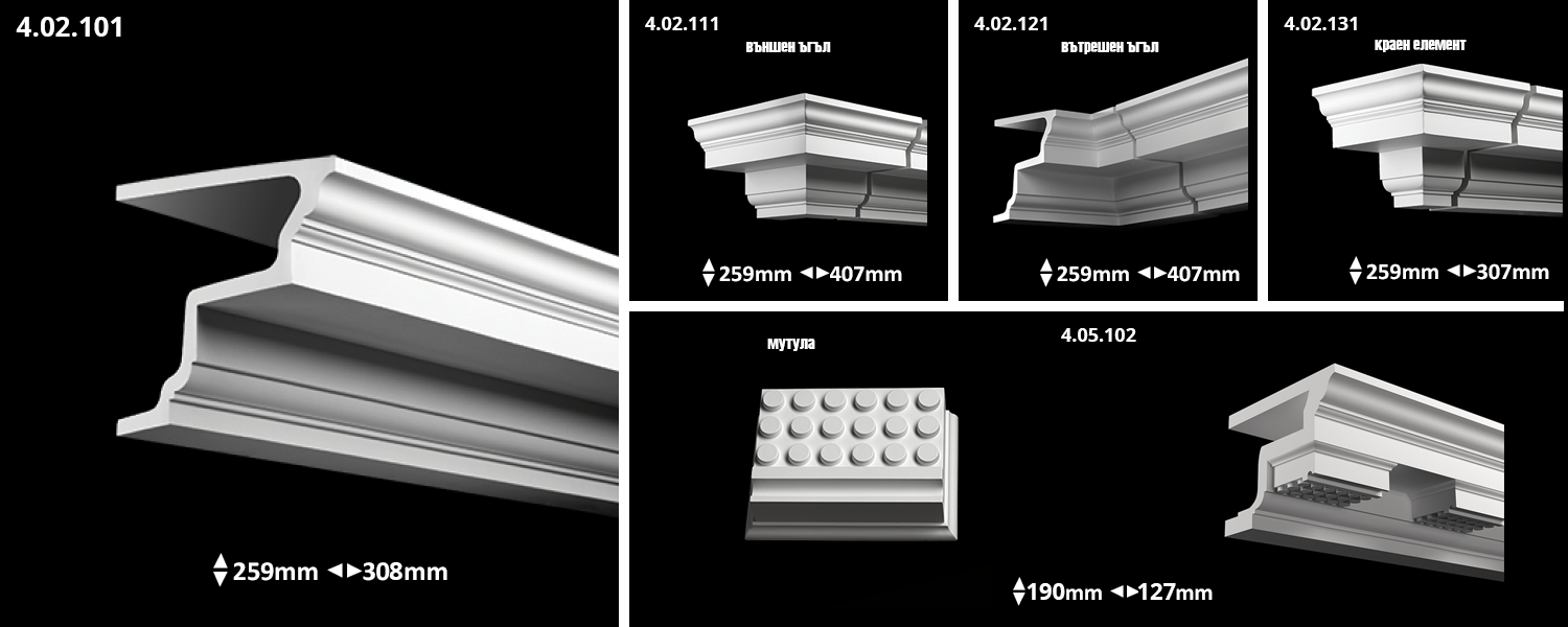 Корнизния профил, в зависимост от мястото на неговия монтаж може да бъде няколко вида – цокълен, надпрозоречен, подпрозоречен, венчаващ, междуетажен, както и над подиуми и пиедестали.