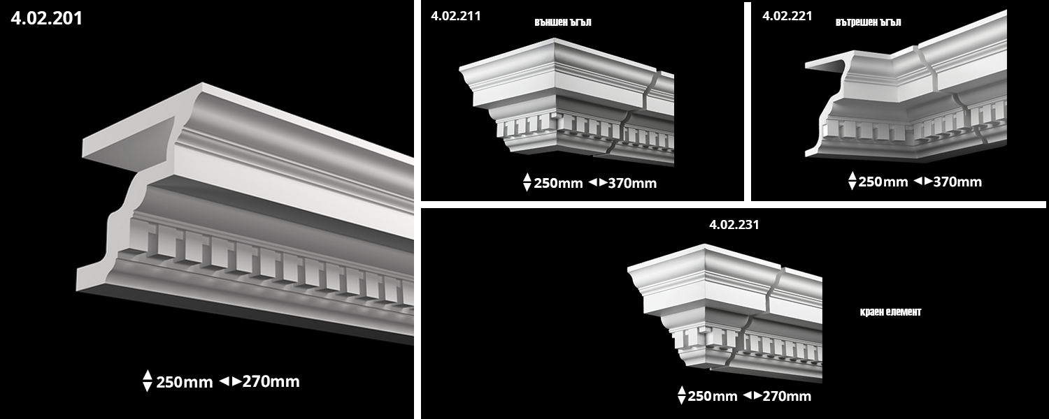 Корнизния профил, в зависимост от мястото на неговия монтаж може да бъде няколко вида – цокълен, надпрозоречен, подпрозоречен, венчаващ, междуетажен, както и над подиуми и пиедестали.