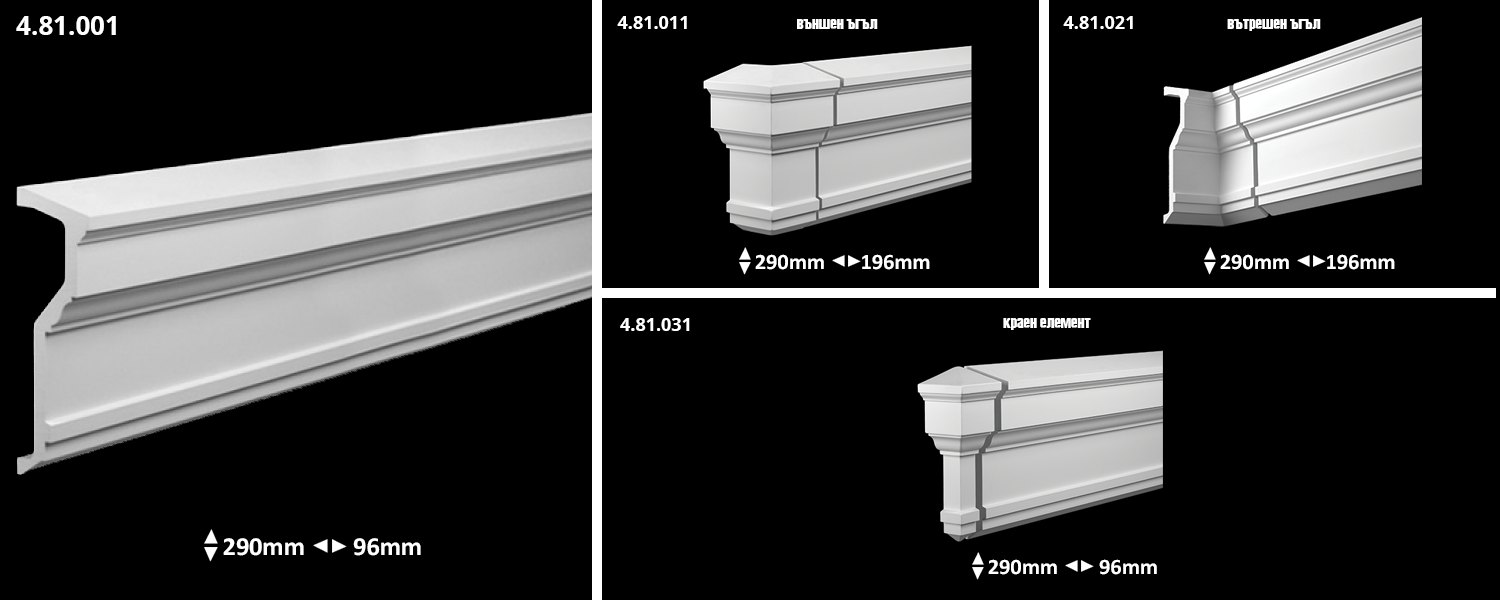 Корнизния профил, в зависимост от мястото на неговия монтаж може да бъде няколко вида – цокълен, надпрозоречен, подпрозоречен, венчаващ, междуетажен, както и над подиуми и пиедестали.