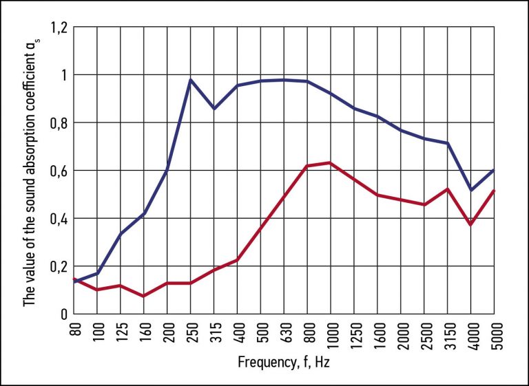 коефициент на звукопоглъщане без запълване на въздушния участък между акустичните панеликоефициент на звукопоглъщане при запълване на въздушния участък между панелите с вата Isover Premium 50 мм