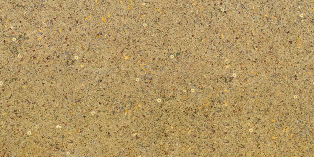 Ръчно косено тиролско алпийско сено с цветни венчелистчета – от пирен, метличина, слънчоглед, лавандула, рози и около 5 маргаритки на m². Предлага се като цялостно покритие върху дишащ ленен филц или ленен филц със самозалепващо PVC-free фолио.