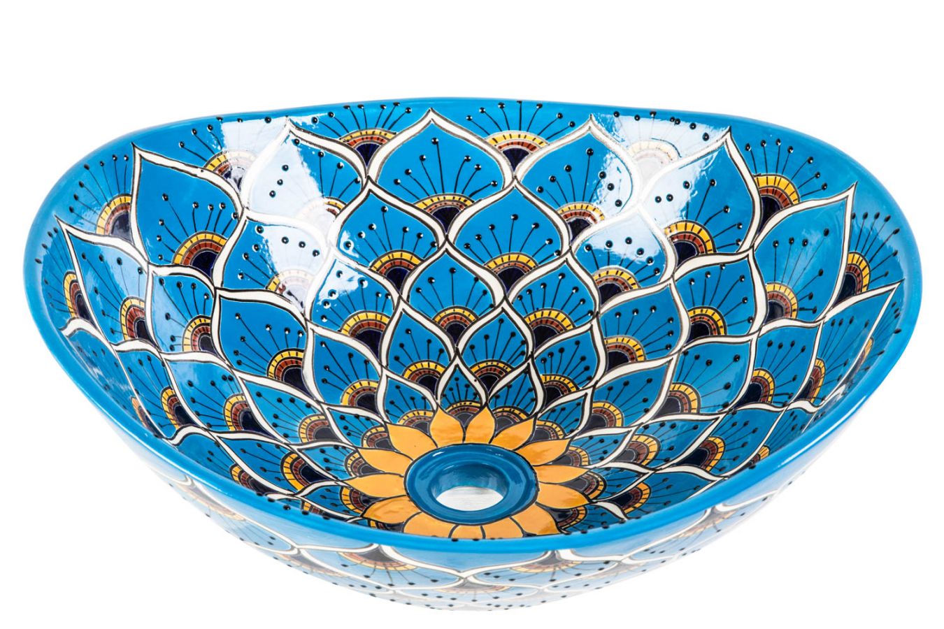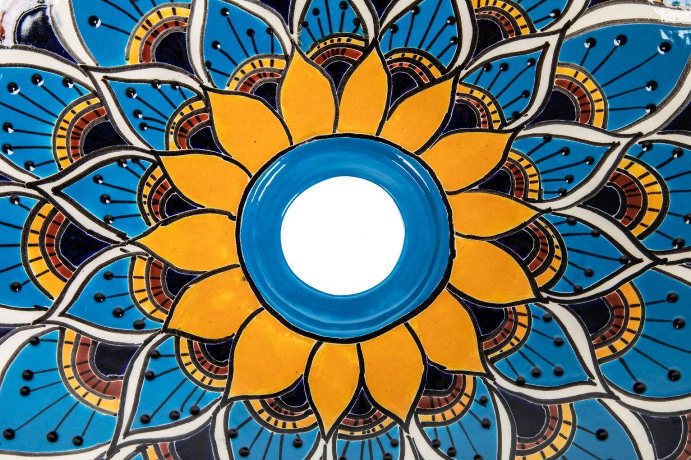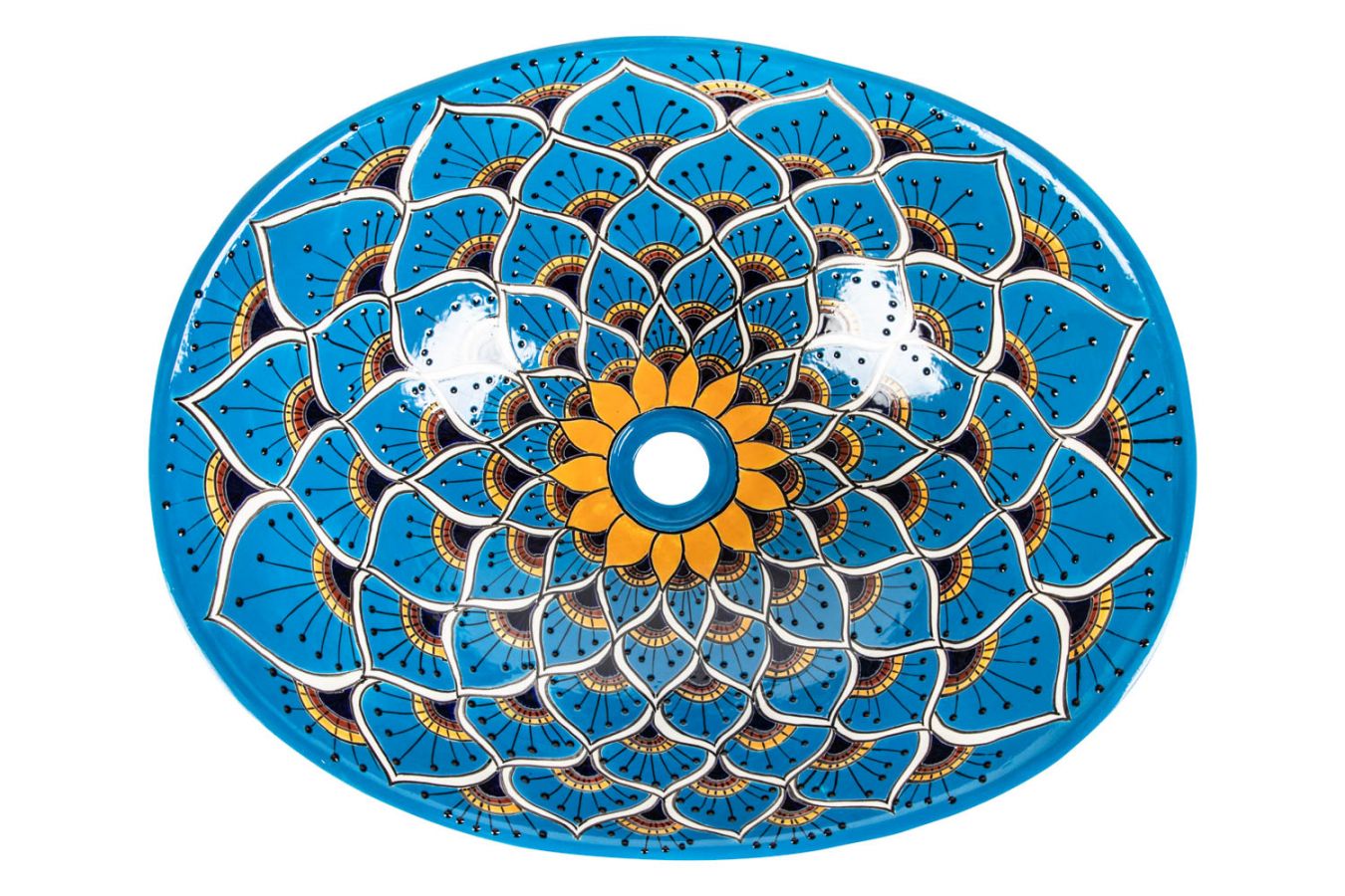 Керамичен умивалник за плот, произведен в Мексико. Богато декорирана и ръчно рисувана мексиканска мивка. Умивалникът е остъклен, което го прави устойчив на надраскване и протриване на шарката.