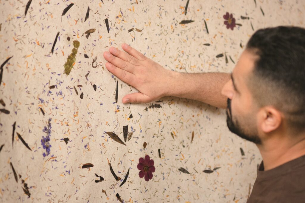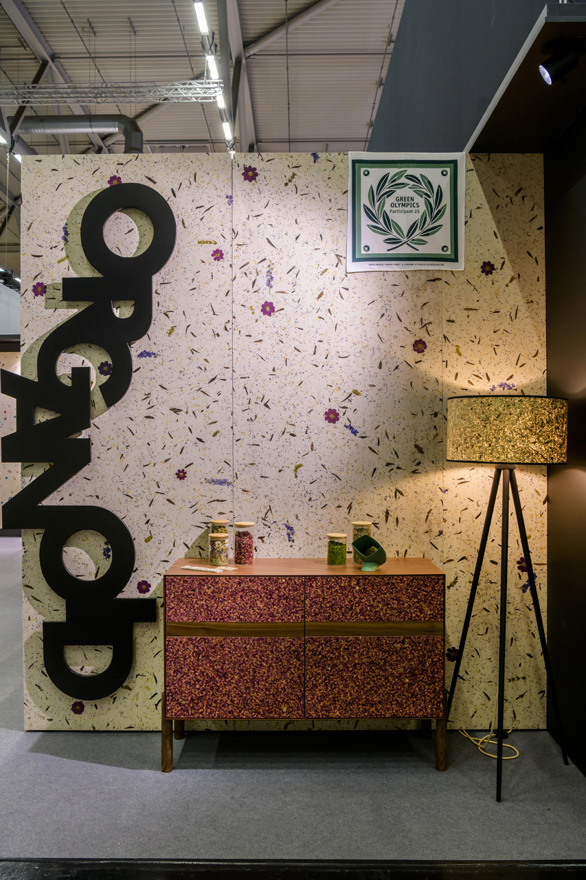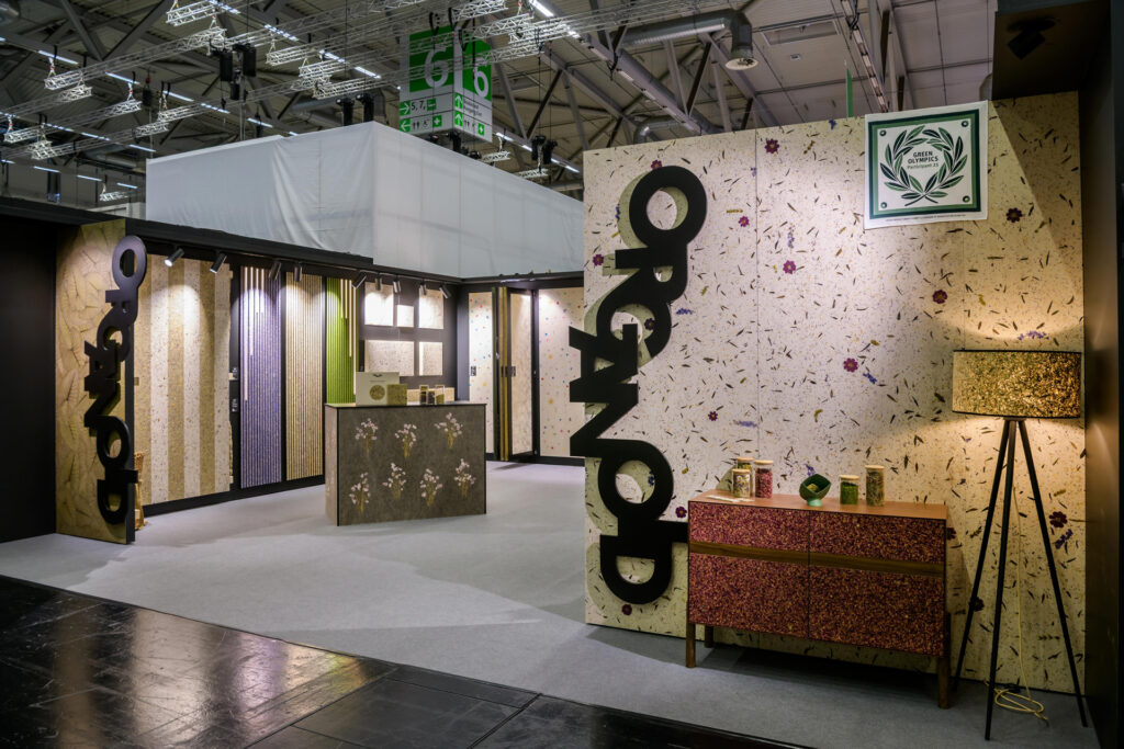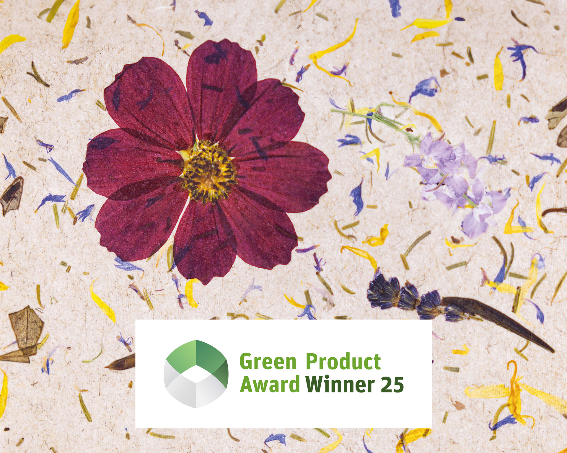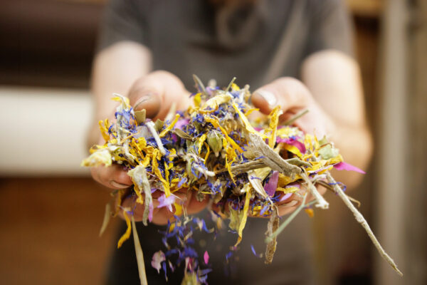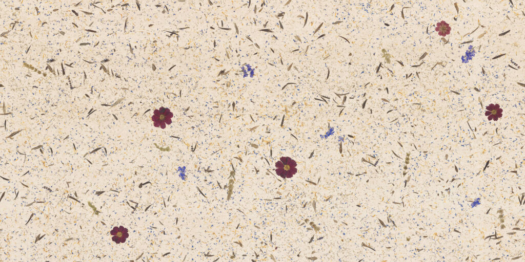Средиземноморски билки, маслинови листа, около 3 ярки цветя космос на m², около 3 цветя делфиниум на m², гръцки планински чай и цветни венчелистчета върху дишаща ленена основа.