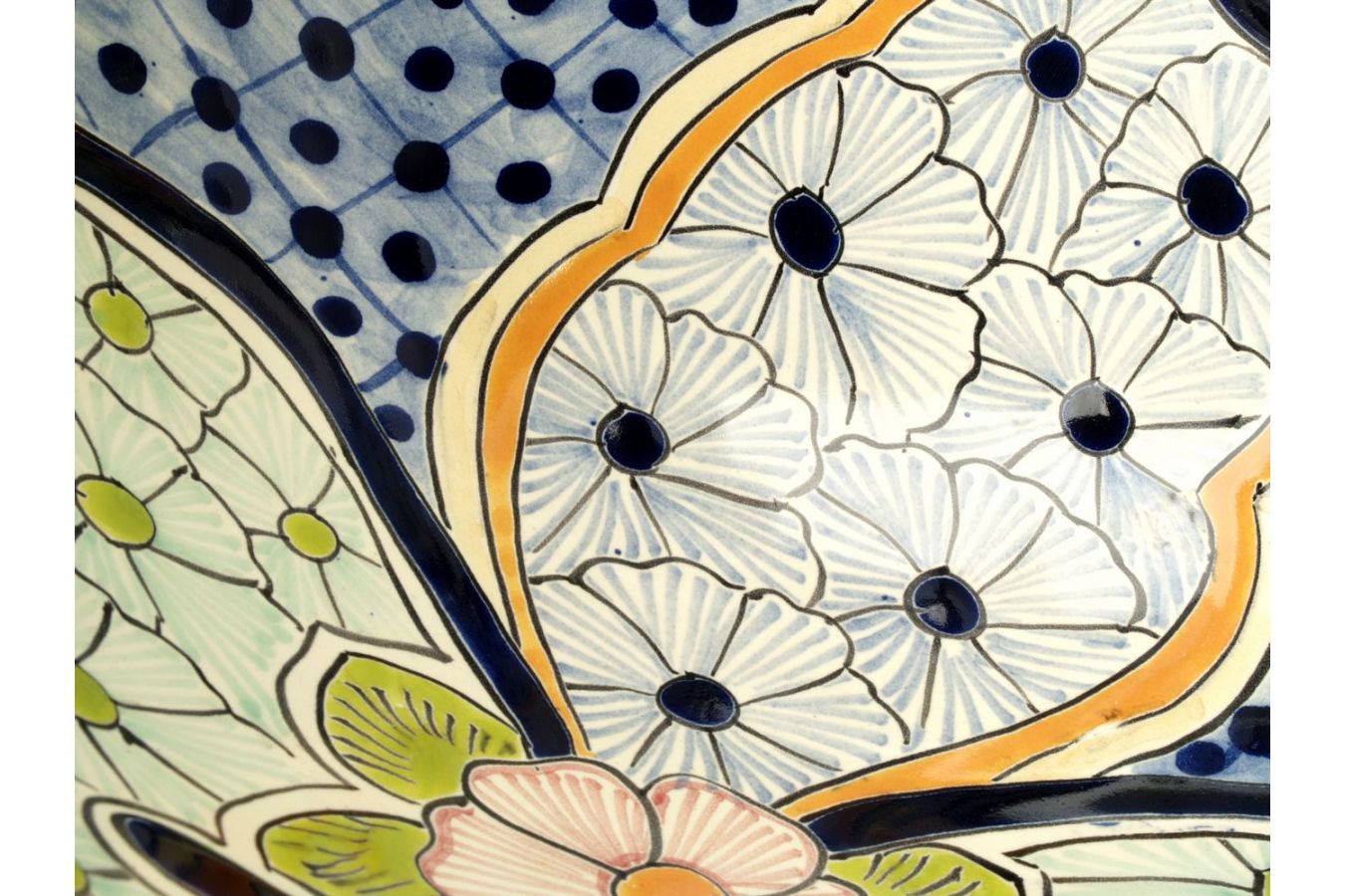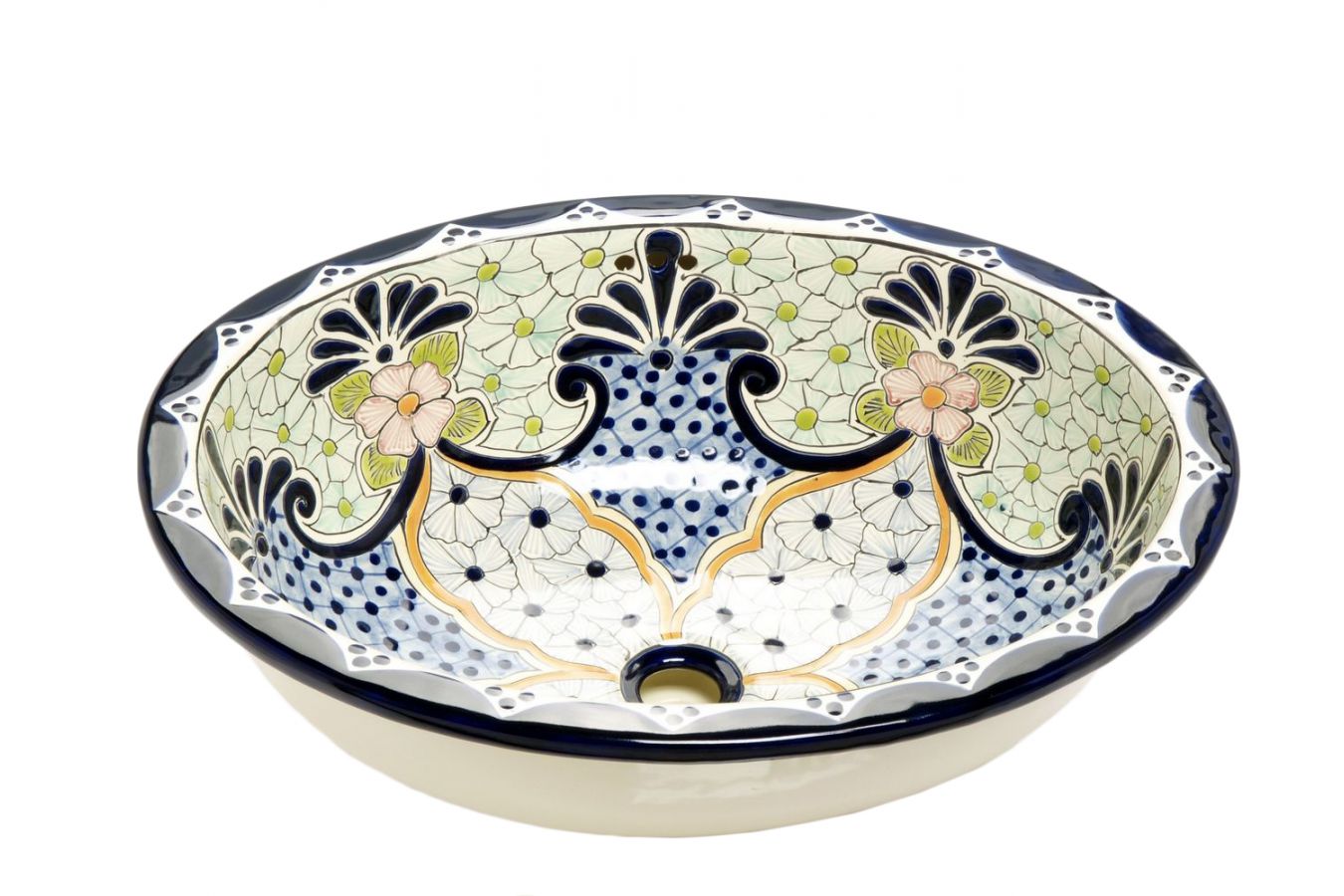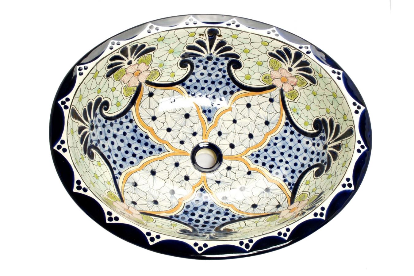 Керамичен умивалник за плот, произведен в Мексико. Богато декорирана и ръчно рисувана мексиканска мивка. Умивалникът е остъклен, което го прави устойчив на надраскване и протриване на шарката.