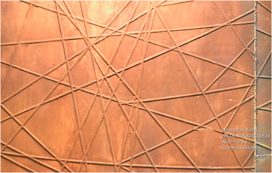 Гъвкавите минерални тапети корозирал метал и кортен стомана HeavyRoll перфектно пресъздават излъчването на ръждясалите метални повърхности. Моделът е изцяло ръчно изработен, благодарение на което има автентичен, уникален и индивидуален облик. Серията декоративни фурнири HeavyRoll предлага широка гама от възможности за интериорен дизайн.