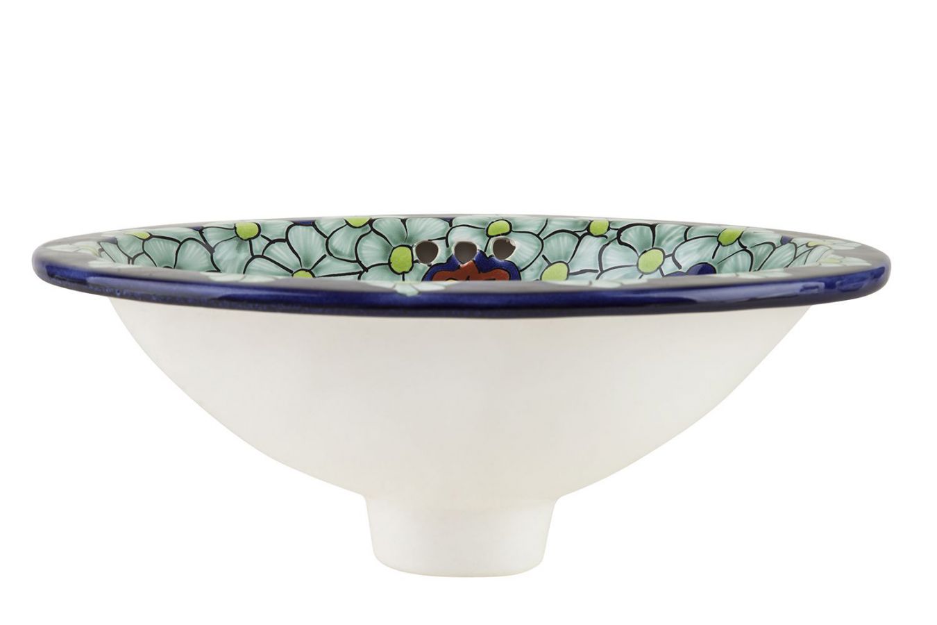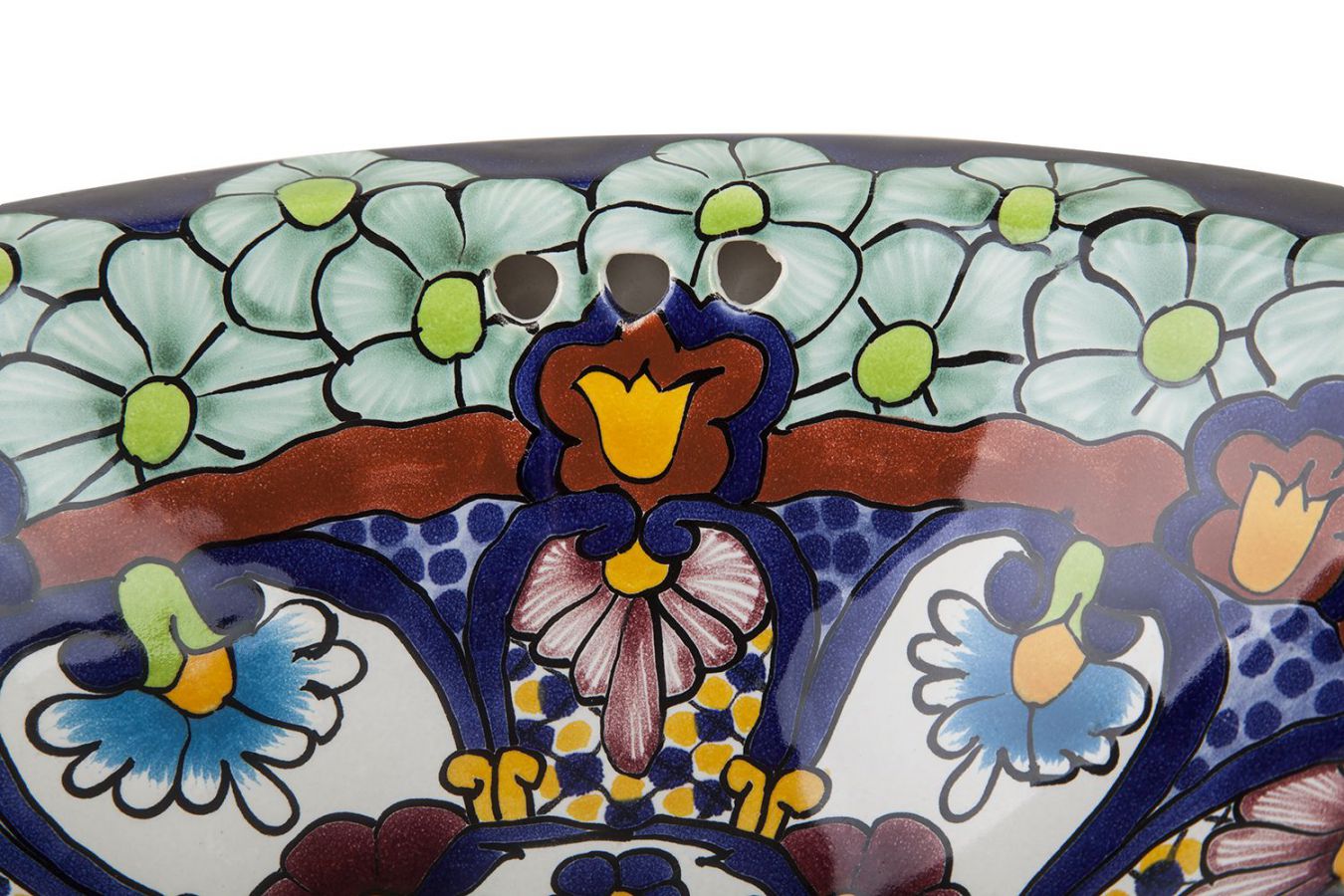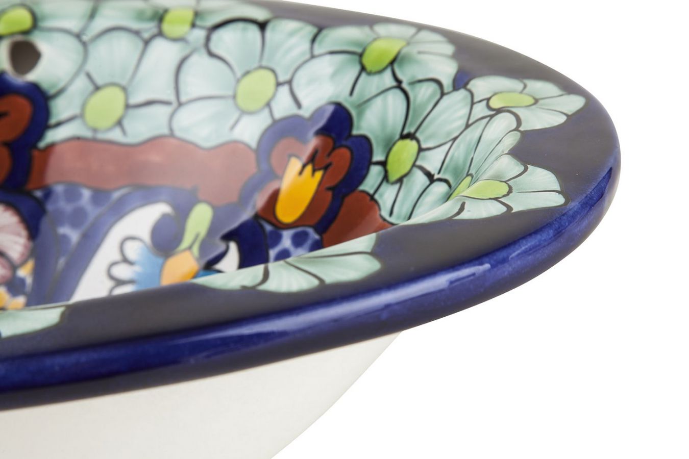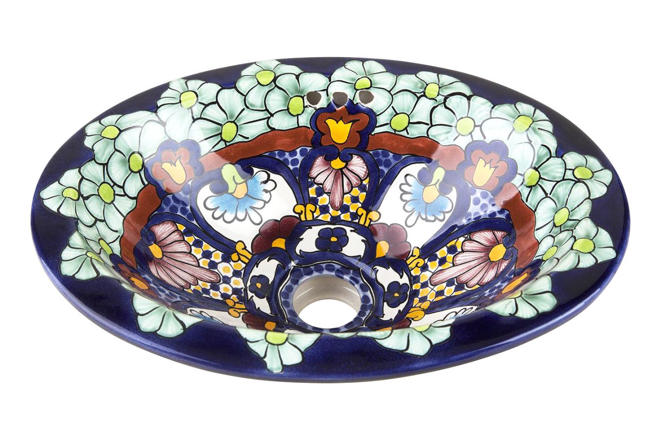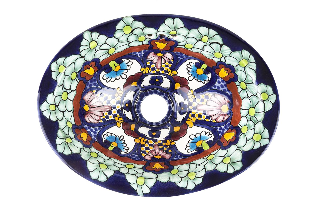 Керамичен умивалник за плот, произведен в Мексико. Богато декорирана и ръчно рисувана мексиканска мивка. Умивалникът е остъклен, което го прави устойчив на надраскване и протриване на шарката.
