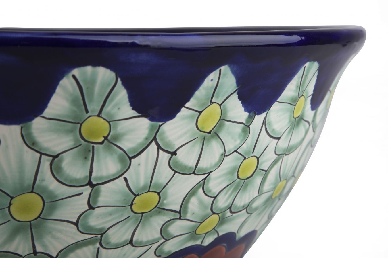 Керамичен умивалник за плот, произведен в Мексико. Богато декорирана и ръчно рисувана мексиканска мивка. Умивалникът е остъклен, което го прави устойчив на надраскване и протриване на шарката.