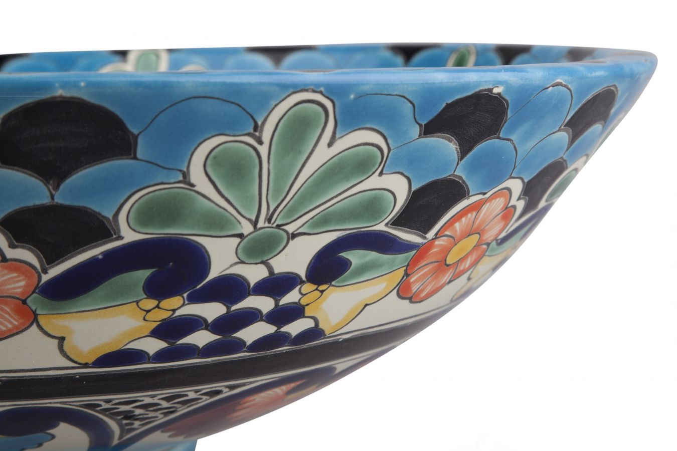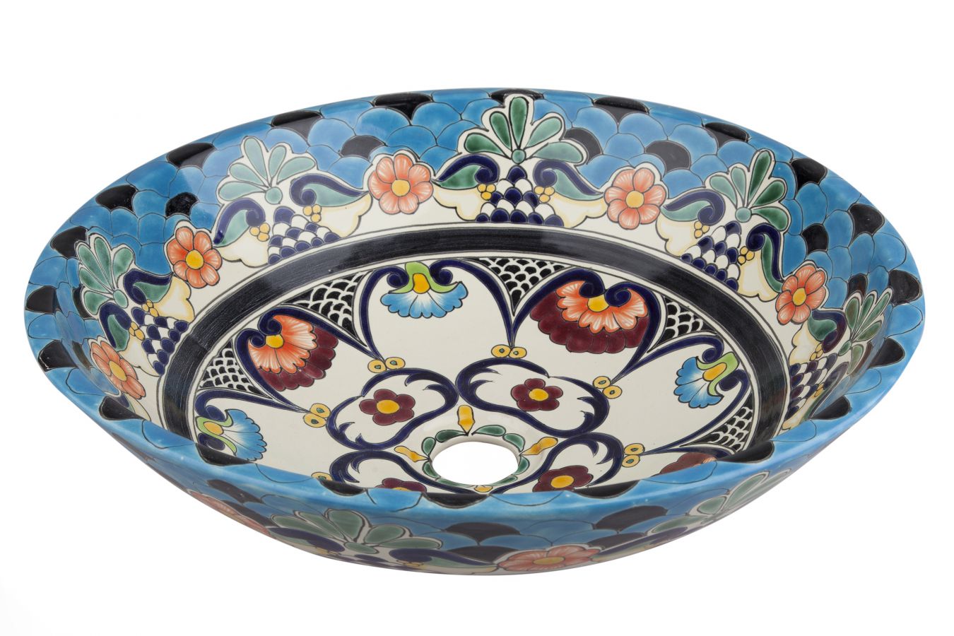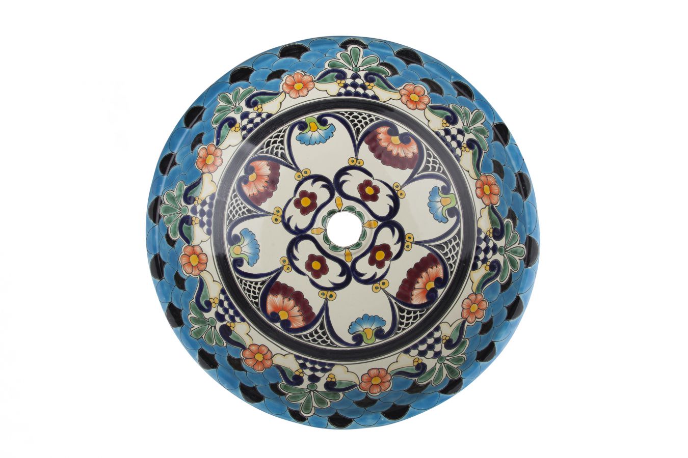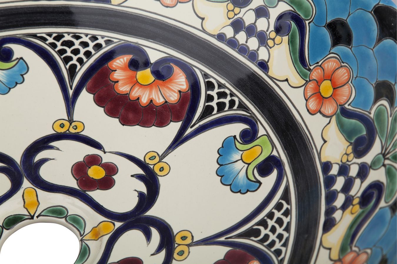 Керамичен умивалник за плот, произведен в Мексико. Богато декорирана и ръчно рисувана мексиканска мивка. Умивалникът е остъклен, което го прави устойчив на надраскване и протриване на шарката.