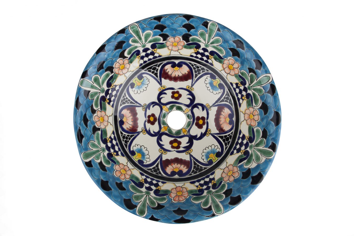Керамичен умивалник за плот, произведен в Мексико. Богато декорирана и ръчно рисувана мексиканска мивка. Умивалникът е остъклен, което го прави устойчив на надраскване и протриване на шарката.