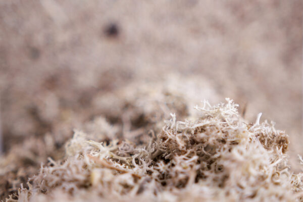 Сив мъх върху ленена основа – създаден чрез ъпсайклинг и комбиниран с дишащ ленен филц или екологично самозалепващо PVC-free фолио.