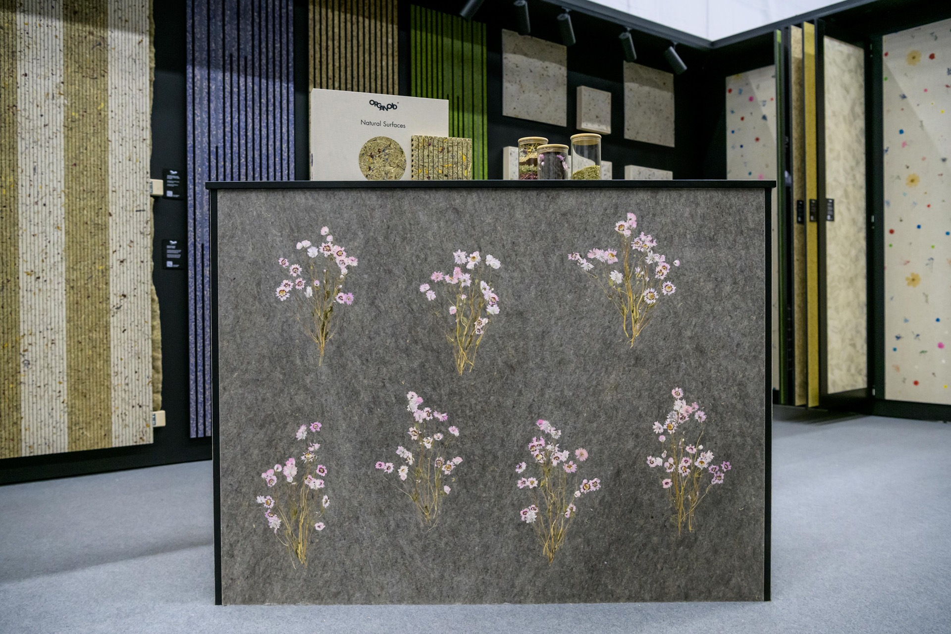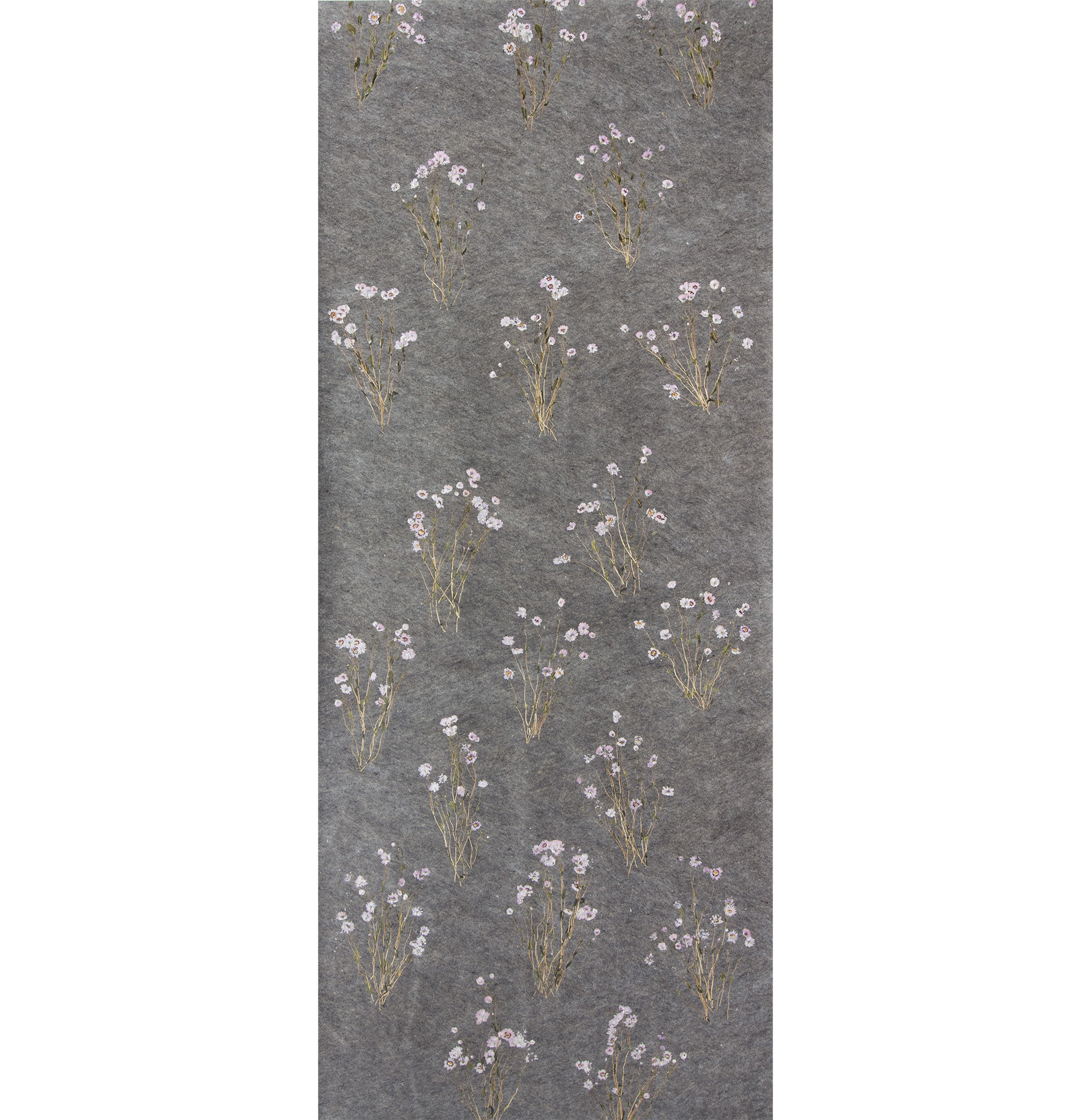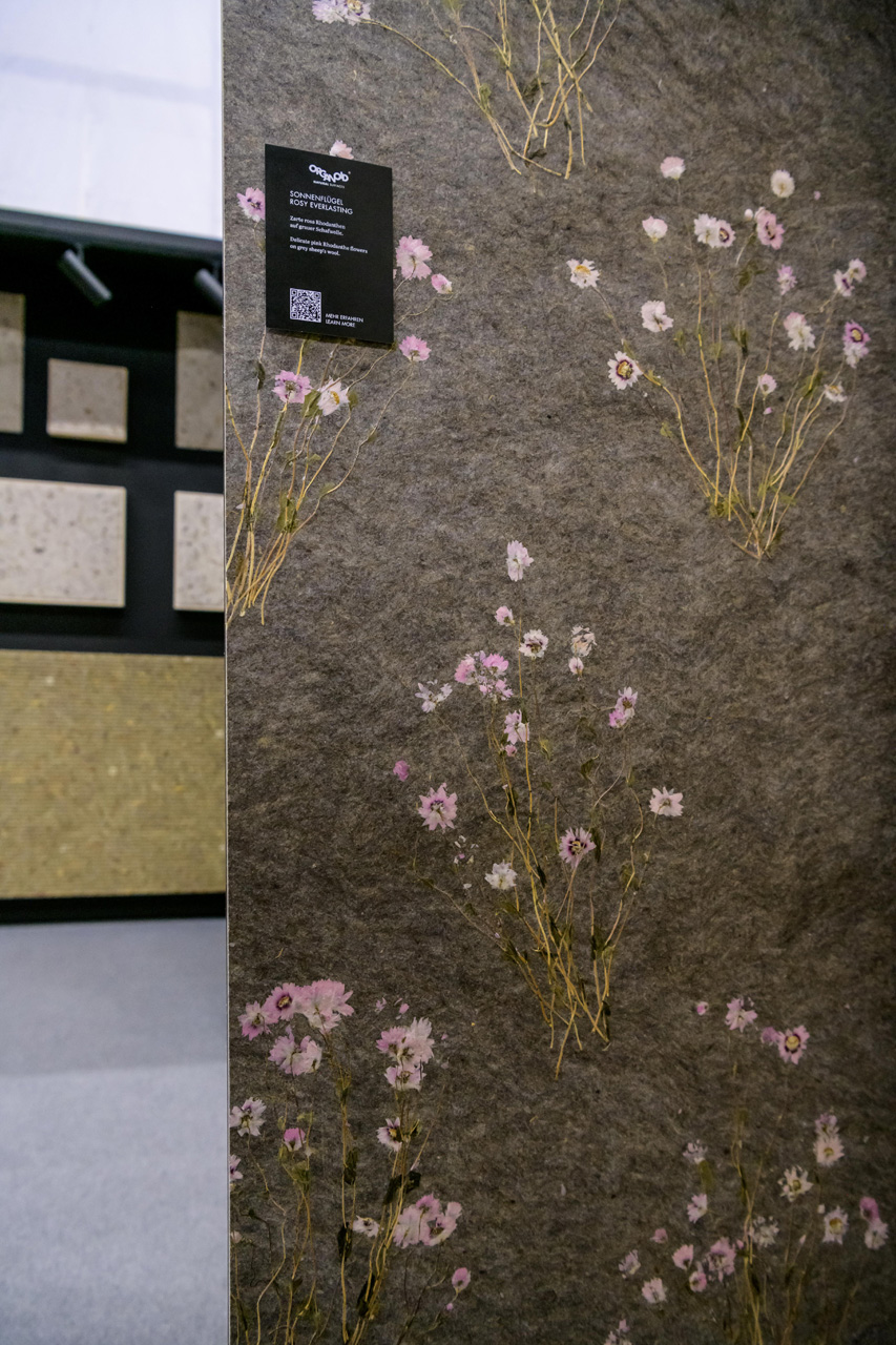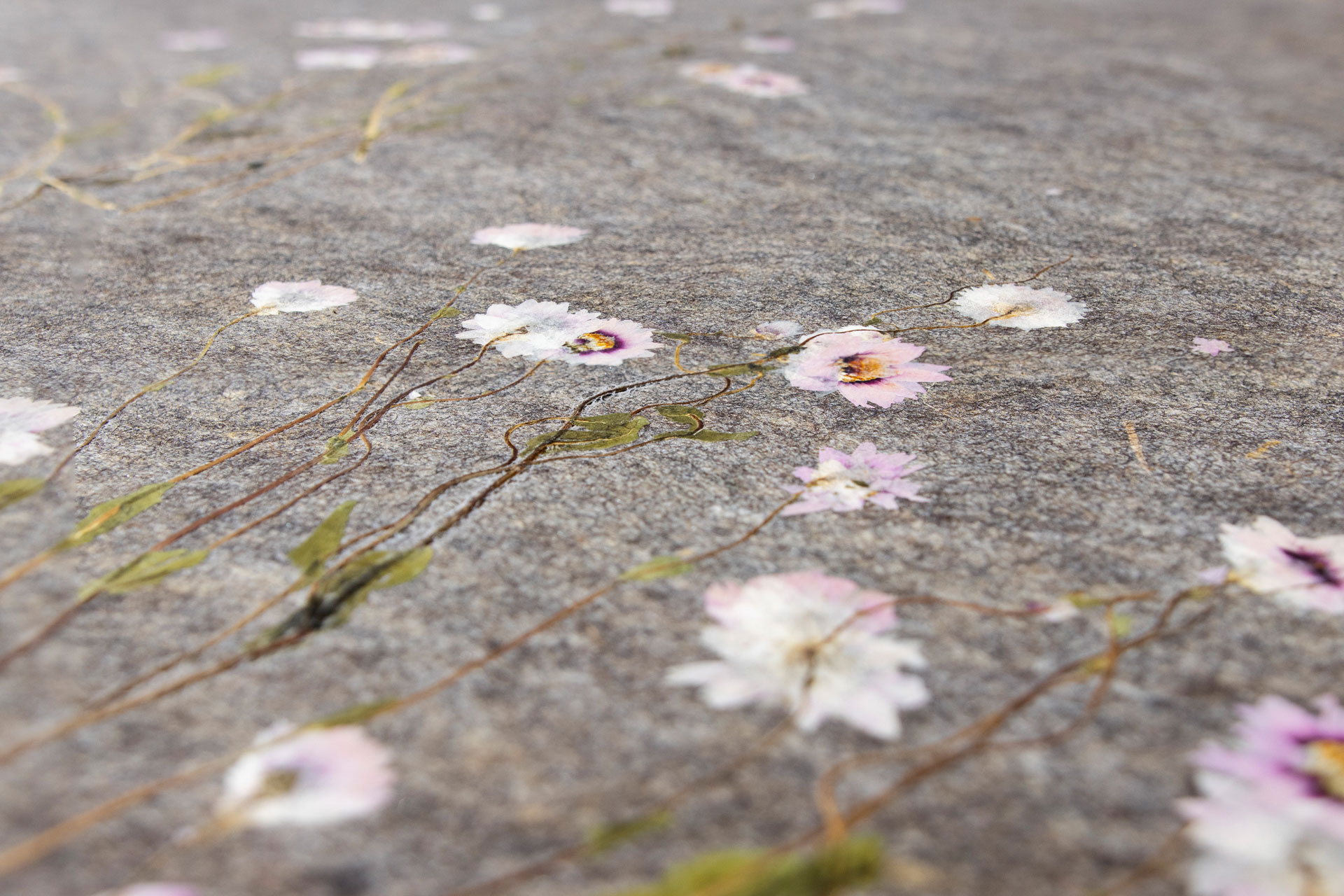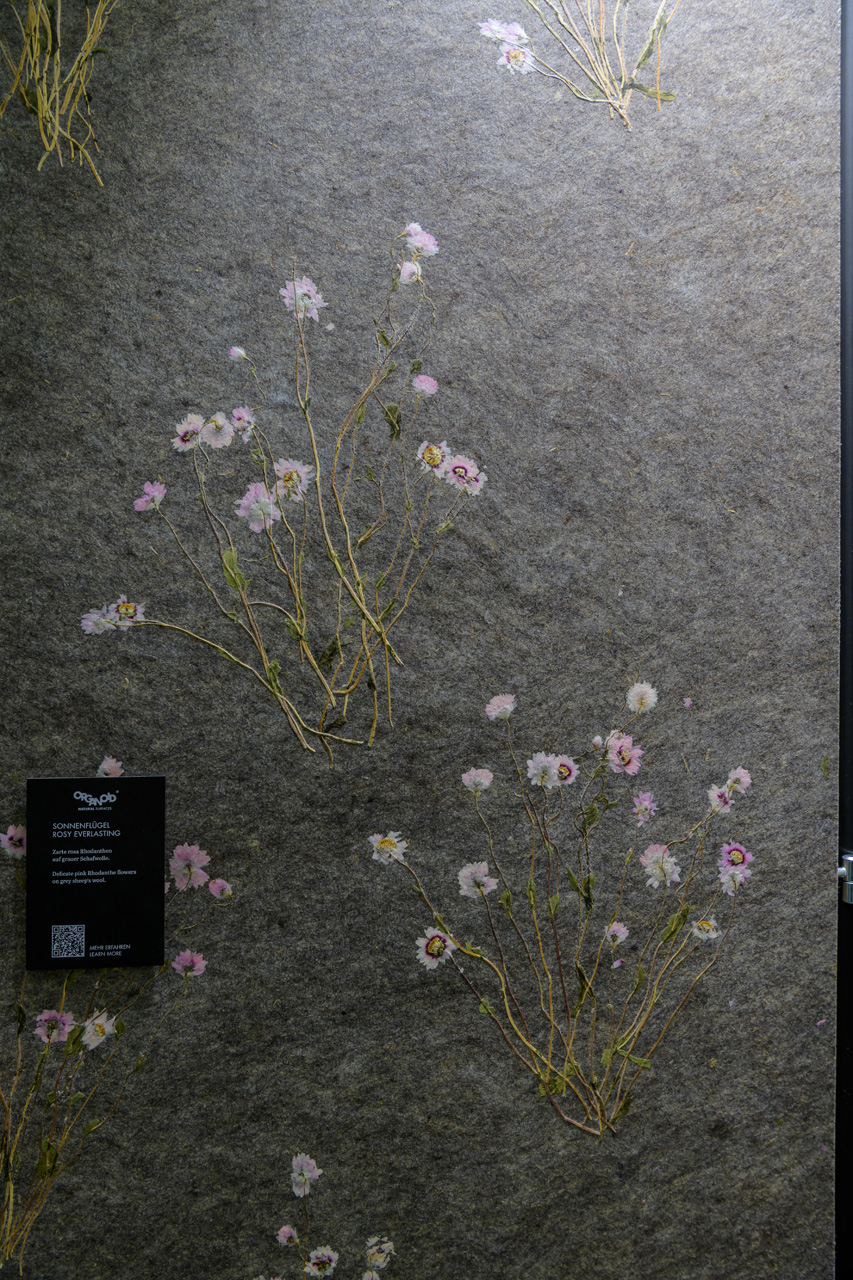 Сивата овча вълна балансира температурата, регулира влагата и внася усещане за комфорт със своята естествена топлина. Деликатните цветове роданте, произхождащи от Австралия, допринасят за лекота и вечна елегантност със своите изящни цветчета.