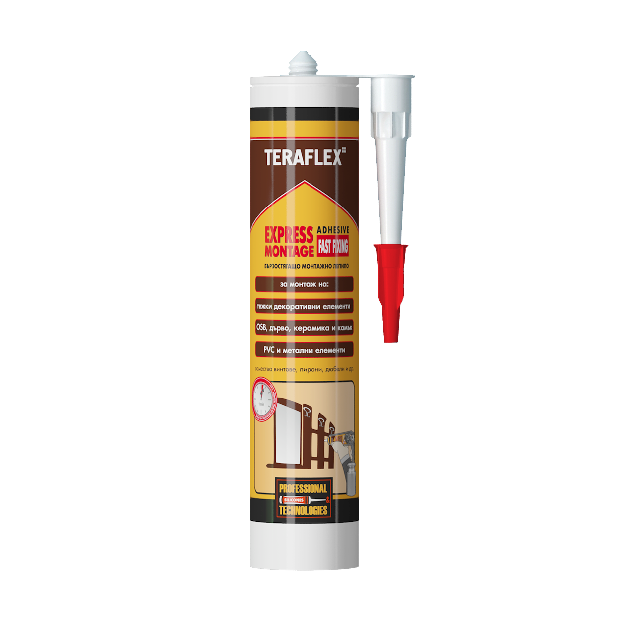 ТЕРАФЛЕКС® EXPRESS е бързостягащо монтажно лепило с формула на база разтворители, която свързва моментално, без изчакване. Лепилото е с много голяма начална якост и има отлична адхезия към почти всички строителни материали – дърво, бетон, керамика, камък, мазилка, стъкло, PVC и др. Подходящо е за лепене на различни порьозни и непорьозни материали към тях, без да са необходими инструменти и без допълнително механично крепване, замествайки употребата на гвоздеи, винтове, дюбели при монтажните работи. За вътрешна и външна употреба.