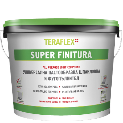ТЕРАФЛЕКС® SUPER FINITURA ПАСТООБРАЗНА ПОЛИМЕРНА ШПАКЛОВКА И ФУГОПЪЛНИТЕЛ е висококачествена готова за употреба смес на винилова основа, предназначена за фино шпакловане и направа на гладък финишен слой върху стени и тавани, преди боядисване. ТЕРАФЛЕКС® SUPER FINITURA се използва за завършване и обработка на фуги при монтаж на гипсокартон и за поправка на пукнатини при интериорни стени и тавани, които не са подложени на влага. Специалната формула на тази полимерна шпакловка и отвореното време дават комфорт на работа и способстват за нулевото свиване на положеното покритие и добър завършен вид на фугите (не се напуква).