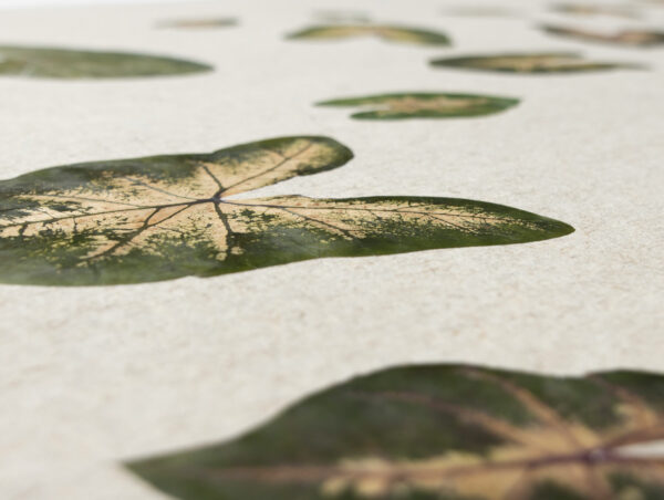Естествени произведения на изкуството за вашите стени! Завладяващите листа на каладиума, с техния впечатляващ контраст между зелено и бяло, внасят ярката красота на тропическите дъждовни гори във вашето пространство. Меката листна структура придава органична дълбочина на повърхността, а уникалните шарки изглеждат сякаш са изрисувани от самата природа. Истински акцент за всеки, който обича цвят, жизненост и тропическа елегантност!