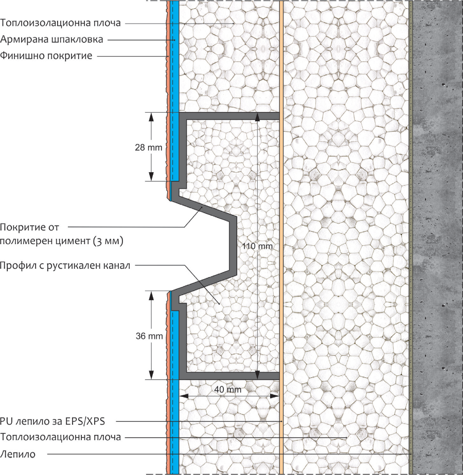 Прецизната работа при монтажа, определя протичането на рустикалната фасада в прави линии по нейната цяла дължина. Графиката показва лесната, но много функционална интеграция на профилите в топлоизолационната система.